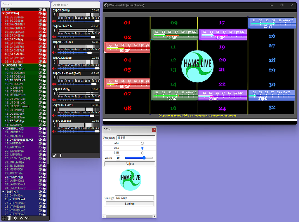 hams.live is great for everyone, but especially in the following circumstances: hearing ALL stations in a net or roundtable Noise from local Radio Frequency Interference poor receive coverage in certain directions limited Space and/or local restrictions for antennas THe system provides better chances to receive transmitted signals than even the BEST receiver at your location, because it supports copying the signal from MANY locations. The system elements are OBS Studio software on a user’s computer, and web services running under a common domain. Users can identify, efficiently manage and connect to hundreds of freely available SDR Sources worldwide. The SDR Sources could easily be accessed using only a web browser, and some have tried doing this. The chance of receiving information from a transmitter potentially increases greatly if there are SDR Sources in place at location(s) with favorable radio propagation conditions. Finding the best available SDR Source for a given situation has become a challenge for many….but not with hams.live!