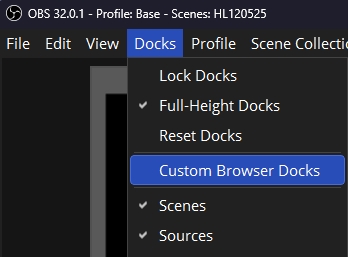 In OBS, go to DOCKS – CUSTOM BROWSER DOCKS