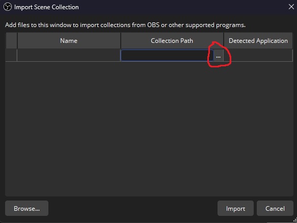 In the Import Scene Collection dialog, click the three dots under Collection Path and