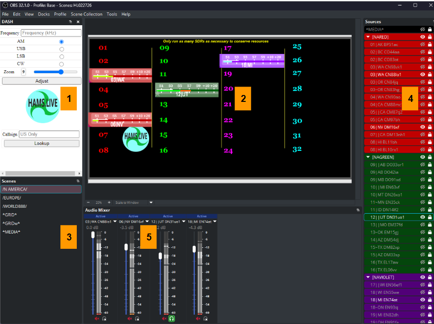The Scenes List controls which set of SDRs within a selected OBS Scene Collection are loaded into the SDR Sources List. The Scene name describes what purpose that the Scene provides (e.g., CONTINENT for wide coverage across a continent, REGIONAL for local coverage). Select a Scene based on what geographic assortment of SDRs is desired. Users can also create their own custom Scenes in a Scene Collection by selecting which SDRs are desired.
