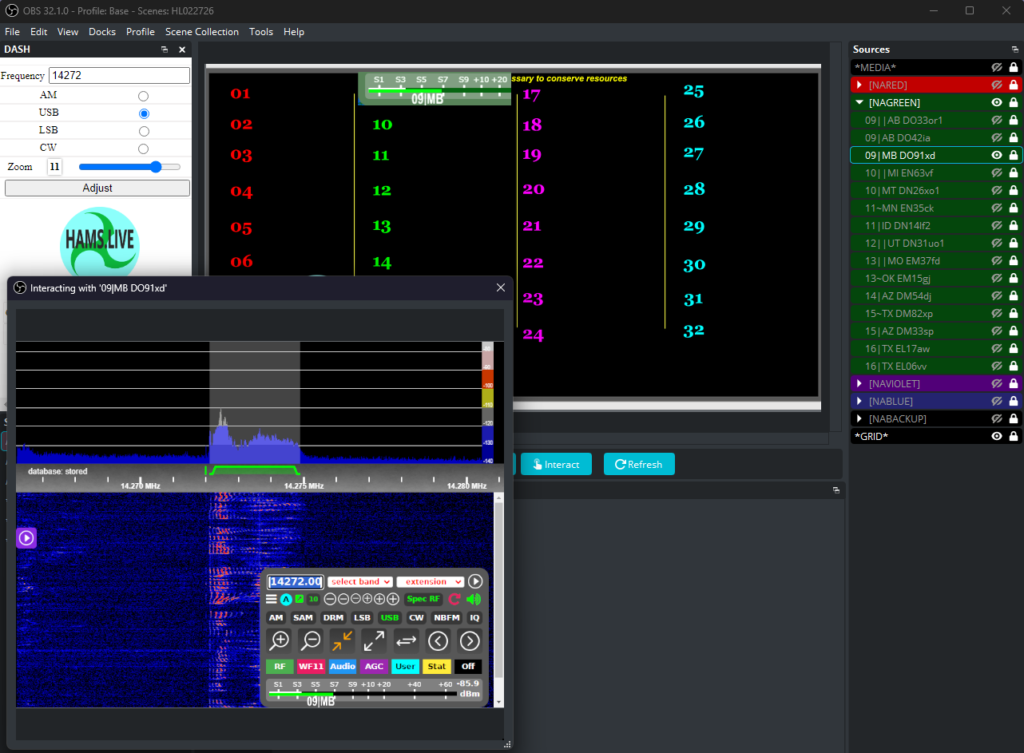 The DASHboard controls basic SDR parameters. In the Frequency field, type desired frequency IN KILOHERTZ with no spaces. Select the desired mode by clicking a radio button next to AM, USB, or LSB. If desired, adjust the SDR waterfall zoom level. Then, click the ADJUST button. There will be no visual indication, but after doing this all SDRs loaded into an OBS Scene Collection will be updated with this information. After activating one or more SDRs, changing any of the DASHboard parameters and clicking ADJUST will cause the SDR(s) to refresh with new parameters.
