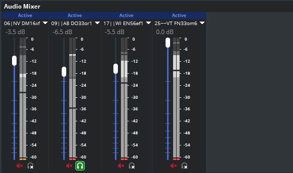 The Audio Mixer is where audio for activated SDRs can be controlled. As one or more SDRs are activated in the SDR Sources List, a slider control for each one will appear in the Audio Mixer along with the SDR name. SDR slider controls will be displayed in alphabetical order. Each slider control has two buttons. The red button is for streaming in OBS and is no longer used for hams.live. The other button looks like headphones, and this is the Monitor button controlling audio monitoring. When an SDR activates it should come up muted by default. Pressing the Monitor button should unmute audio for that Source and the Monitor button will turn green. If an SDR is unmuted and then de-activated in the SDR Sources List, OBS will remember the last state that the mute toggle was left in. When un-muting an SDR, sound from the SDR should be heard coming from your default OBS monitoring device (OBS main menu/File/Settings/Audio/Advanced/Monitoring Device).